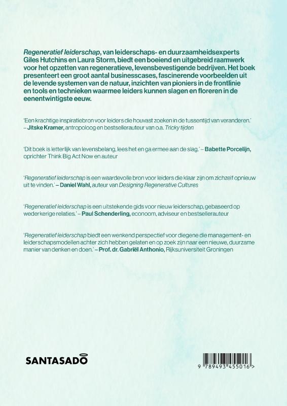 Regeneratief leiderschap, van leiderschaps- en duurzaamheidsexperts Giles Hutchins en Laura Storm, biedt een boeiend en uitgebreid raamwerk voor het opzetten van regeneratieve, levensbevestigende bedrijven. Het boek presenteert een groot aantal businesscases, fascinerende voorbeelden uit de levende systemen van de natuur, inzichten van pioniers in de frontlinie en tools en technieken waarmee leiders kunnen slagen en floreren in de eenentwintigste eeuw. ‘Een krachtige inspiratiebron voor leiders die houvast zoeken in de tussentijd van veranderen.’ – Jitske Kramer, antropoloog en bestsellerauteur van o.a. Tricky tijden ‘Dit boek is letterlijk van levensbelang, lees het en ga ermee aan de slag.’ – Babette Porcelijn, oprichter Think Big Act Now en auteur ‘Regeneratief leiderschap is een waardevolle bron voor leiders die klaar zijn om zichzelf opnieuw uit te vinden.’ – Daniel Wahl, auteur van Designing Regenerative Cultures ‘Regeneratief leiderschap is een uitstekende gids voor nieuw leiderschap, gebaseerd op wederkerige relaties.’ – Paul Schenderling, econoom, adviseur en bestsellerauteur ‘Regeneratief leiderschap biedt een wenkend perspectief voor diegene die management- en leiderschapsmodellen achter zich hebben gelaten en op zoek zijn naar een nieuwe, duurzame manier van denken en doen.’ – Prof. dr. Gabriël Anthonio, Rijksuniversiteit Groningen