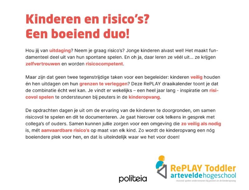 Kinderen en risico’s? Een boeiend duo! Hou jij van uitdaging? Neem je graag risico’s? Jonge kinderen alvast wel! Het maakt fundamenteel deel uit van hun spontane spelen. En oh ja, daar leren ze véél uit... ze krijgen zelfvertrouwen en worden risicocompetent. Maar zijn dat geen twee tegenstrijdige taken voor een begeleider: kinderen veilig houden én hen uitdagen om hun grenzen te verleggen? Deze RePLAY draaikalender toont je dat de combinatie écht wel kan. Je vindt er wekelijks – een heel jaar lang - inspiratie om risicovol spelen te ondersteunen bij peuters in de kinderopvang. De opdrachten dagen je uit om de ervaring van de kinderen te doorgronden, om samen risicovol te spelen en dit te documenteren. Je gaat hierover ook telkens in gesprek met collega’s of ouders. Samen kunnen jullie zorgen voor een omgeving die zo veilig als nodig is, mét aanvaardbare risico’s op maat van elk kind. Zo wordt de kinderopvang een nóg boeiendere plek voor hen, en dat is uiteindelijk waar we het voor doen!