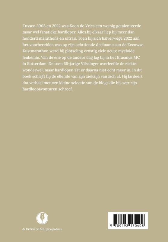 Tussen 2003 en 2022 was Koen de Bries een weinig getalenteerde mar wel fanatieke hardloper. Alles bij elkaar liep hij meer dan honderd marathons en ultra’s. Toen hij zich halverwege 2022 aan het voorbereiden was op zijn achttiende deelname aan de Zeeuwse Kustmarathon werd hij plotseling ernstig ziek: acute myeloïde leukemie. Van de ene op de andere dag lag hij in het Erasmus MC in Rotterdam. De toen 65-jarige Vlissinger overleefde de ziekte wonderwel, maar hardlopen zat er daarna net echt meer in. In dit boek schrijft hij de ellende van zijn ziekzijn van zich af. Hij lardeert dat verhaal met een kleine selectie van de blogs die hij over zijn hardloopavonturen schreef.