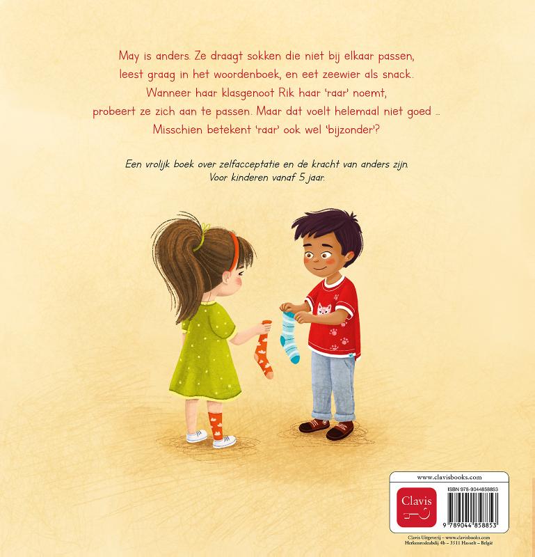 May is anders. Ze draagt sokken die niet bij elkaar passen, leest graag in het woordenboek, en eet zeewier als snack. Wanneer haar klasgenoot Rik haar ‘raar’ noemt, probeert ze zich aan te passen. Maar dat voelt helemaal niet goed … Misschien betekent ‘raar’ ook wel ‘bijzonder’? Een vrolijk boek over zelfacceptatie en de kracht van anders zijn. Voor kinderen vanaf 5 jaar.