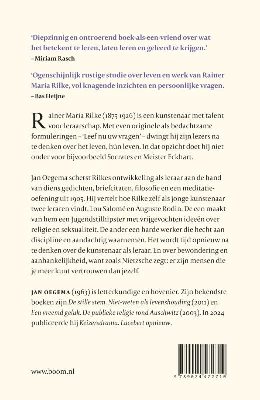 ‘Diepzinnig en ontroerend boek-als-een-vriend over wat het betekent te leren, laten leren en geleerd te krijgen.’ – Miriam Rasch ‘Ogenschijnlijk rustige studie over leven en werk van Rainer Maria Rilke, vol knagende inzichten en persoonlijke vragen. – Bas Heijne Rainer Maria Rilke (1875-1926) is een kunstenaar met talent voor leraarschap. Met even originele als bedachtzame formuleringen – ‘Leef nu uw vragen’ – dwingt hij zijn lezers na te denken over het leven, hún leven. In dat opzicht doet hij niet onder voor bijvoorbeeld Socrates en Meister Eckhart. Jan Oegema schetst Rilkes ontwikkeling als leraar aan de hand van diens gedichten, briefcitaten, filosofie en een meditatieoefening uit 1905. Hij vertelt hoe Rilke zélf als jonge kunstenaar twee leraren vindt, Lou Salomé en Auguste Rodin. De een maakt van hem een Jugendstilhipster met vrijgevochten ideeën over religie en seksualiteit. De ander een harde werker die hecht aan discipline en aandachtig waarnemen. Het wordt tijd opnieuw na te denken over de kunstenaar als leraar. En over bewondering en aanhankelijkheid, want zoals Nietzsche zegt: er zijn mensen die je meer kunt vertrouwen dan jezelf. Jan Oegema (1963) is letterkundige en hovenier. Zijn bekendste boeken zijn De stille stem. Niet-weten als levenshouding (2011) en Een vreemd geluk. De publieke religie rond Auschwitz (2003). In 2024 publiceerde hij Keizersdrama. Lucebert opnieuw .