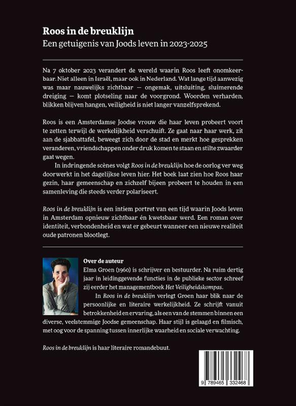 Roos in de breuklijn Een getuigenis van Joods leven in 2023–2025 Na 7 oktober 2023 verandert de wereld waarin Roos leeft onomkeerbaar. Niet alleen in Israël, maar ook in Nederland. Wat lange tijd aanwezig was maar nauwelijks zichtbaar — ongemak, uitsluiting, sluimerende dreiging — komt plotseling naar de voorgrond. Woorden verharden, blikken blijven hangen, veiligheid is niet langer vanzelfsprekend. Roos is een Amsterdamse Joodse vrouw die haar leven probeert voort te zetten terwijl de werkelijkheid verschuift. Ze gaat naar haar werk, zit aan de sjabbat tafel, beweegt zich door de stad en merkt hoe gesprekken veranderen, vriendschappen onder druk komen te staan en stilte zwaarder gaat wegen. In indringende scènes volgt Roos in de breuklijn hoe de oorlog ver weg doorwerkt in het dagelijkse leven hier. Het boek laat zien hoe Roos haar gezin, haar gemeenschap en zichzelf bijeen probeert te houden in een samenleving die steeds verder polariseert. Roos in de breuklijn is een intiem portret van een tijd waarin Joods leven in Amsterdam opnieuw zichtbaar én kwetsbaar werd. Een roman over identiteit, verbondenheid en wat er gebeurt wanneer een nieuwe realiteit oude patronen blootlegt. Over de auteur Elma Groen (1960) is schrijver en bestuurder. Na ruim dertig jaar in leidinggevende functies in de publieke sector schreef zij eerder het managementboek Het Veiligheidskompas. In Roos in de breuklijn verlegt Groen haar blik naar de persoonlijke en literaire werkelijkheid. Ze schrijft vanuit betrokkenheid en ervaring, als een van de stemmen binnen een diverse, veelstemmige Joodse gemeenschap. Haar stijl is gelaagd en filmisch, met oog voor de spanning tussen innerlijke waarheid en sociale verwachting. Roos in de breuklijn is haar literaire romandebuut.