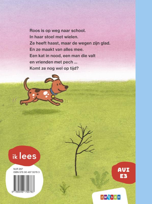 Roos is op weg naar school. In haar stoel met wielen. Ze heeft haast. Maar de wegen zijn glad. En ze maakt van alles mee. Een kat in nood, een man die valt en vrienden met pech … Komt ze nog wel op tijd? Roos doet haar best om op tijd op school te komen in haar stoel met wielen. Buiten is het koud en glad. Onderweg komt ze steeds mensen tegen die haar hulp goed kunnen gebruiken. Een kat in nood, een man die uitglijdt, vrienden met pech … Roos schiet te hulp! Kan ze iedereen helpen en ook nog op tijd op school komen? Dit vrolijke en herkenbare verhaal uit de serie ik lees voor beginnende lezers zit vol verrassende wendingen! Dat is met plezier leeskilometers maken!