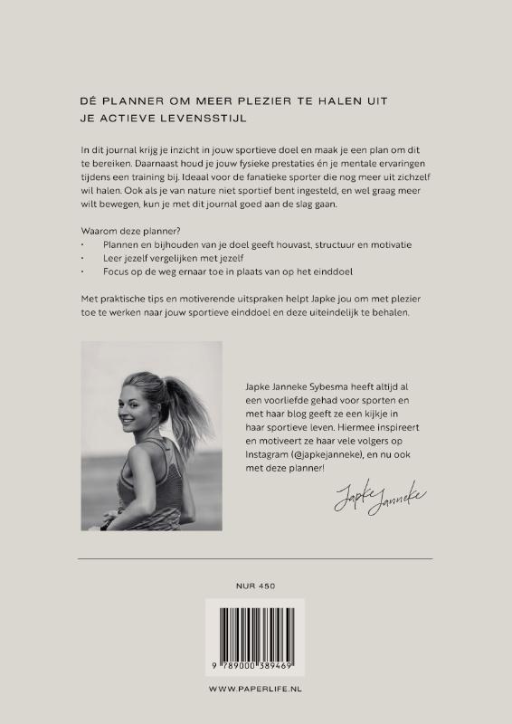 Dé planner om meer plezier te halen uit je actieve levensstijl In dit journal krijg je inzicht in jouw sportieve doel en maak je een plan om dit te bereiken. Daarnaast houd je jouw fysieke prestaties én je mentale ervaringen tijdens een training bij. Ideaal voor de fanatieke sporter die nog meer uit zichzelf wil halen. Ook als je van nature niet sportief bent ingesteld, en wel graag meer wilt bewegen, kun je met dit journal goed aan de slag gaan. Waarom deze planner? Plannen en bijhouden van je doel geeft houvast, structuur en motivatie Leer jezelf vergelijken met jezelf Focus op de weg ernaar toe in plaats van op het einddoel Met praktische tips en motiverende uitspraken helpt Japke jou om met plezier toe te werken naar jouw sportieve einddoel en deze uiteindelijk te behalen. Japke Janneke Sybesma (1991) heeft altijd al een voorliefde gehad voor sporten en met haar blog geeft ze een kijkje in haar sportieve leven. Hiermee inspireert en motiveert ze haar vele volgers op Instagram (@japkejanneke), en nu ook met deze planner!