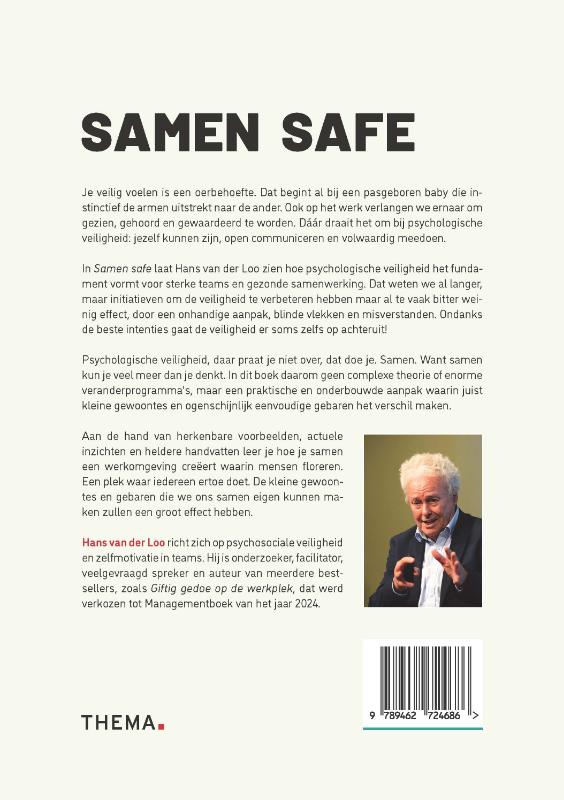 Je veilig voelen is een oerbehoefte. Dat begint al bij een pasgeboren baby die instinctief de armen uitstrekt naar de ander. Ook op het werk verlangen we ernaar om gezien, gehoord en gewaardeerd te worden. Dáár draait het om bij psychologische veiligheid: jezelf kunnen zijn, open communiceren en volwaardig meedoen. In Samen safe laat de auteur zien hoe psychologische veiligheid het fundament vormt voor sterke teams en gezonde samenwerking. Dat weten we al langer, maar initiatieven om de veiligheid te verbeteren hebben maar al te vaak bitter weinig effect, door een onhandige aanpak, blinde vlekken en misverstanden. Ondanks de beste intenties gaat de veiligheid er soms zelfs op achteruit! Psychologische veiligheid moet je niet alleen afspreken, maar vooral dóen. In dit boek daarom geen ingewikkelde theorie of enorme veranderprogramma’s, maar een praktische en onderbouwde aanpak waarin juist kleine gewoontes en ogenschijnlijk eenvoudige gebaren het verschil maken. Aan de hand van herkenbare voorbeelden, actuele inzichten en heldere handvatten leer je hoe je samen een werkomgeving creëert waarin mensen floreren. Een plek waar iedereen ertoe doet. De kleine gewoontes en gebaren die we ons samen eigen kunnen maken zullen een groot effect hebben. Samen safe is de praktische gids voor iedereen die met teams werkt en duurzaam wil bouwen aan vertrouwen, openheid en resultaten.