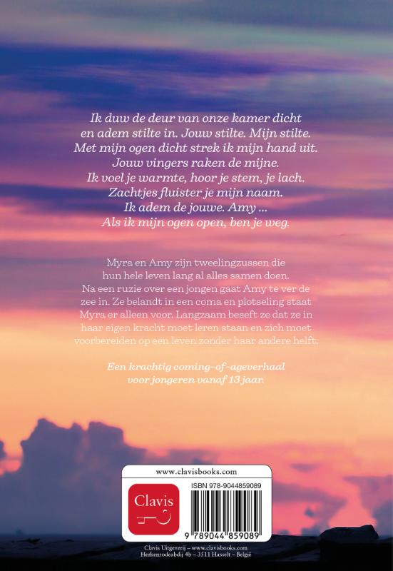 Ik duw de deur van onze kamer dicht en adem stilte in. Jouw stilte. Mijn stilte. Met mijn ogen dicht strek ik mijn hand uit. Jouw vingers raken de mijne. Ik voel je warmte, hoor je stem, je lach. Zachtjes fluister je mijn naam. Ik adem de jouwe. Amy … Als ik mijn ogen open, ben je weg. Myra en Amy zijn tweelingzussen die hun hele leven lang al alles samen doen. Na een ruzie over een jongen gaat Amy te ver de zee in. Ze belandt in een coma en plotseling staat Myra er alleen voor. Langzaam beseft ze dat ze in haar eigen kracht moet leren staan en zich moet voorbereiden op een leven zonder haar andere helft. Een krachtig coming-of-ageverhaal voor jongeren vanaf 13 jaar.