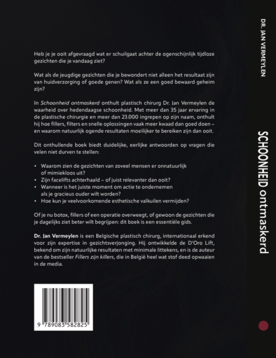 Heb je je ooit afgevraagd wat er schuilgaat achter de ogenschijnlijk tijdloze gezichten die je vandaag ziet? Wat als de jeugdige gezichten die je bewondert niet alleen het resultaat zijn van huidverzorging of goede genen? Wat als ze een goed bewaard geheim zijn? In Schoonheid ontmaskerd onthult plastisch chirurg Dr. Jan Vermeylen de waarheid over hedendaagse schoonheid. Met meer dan 35 jaar ervaring in de plastische chirurgie en meer dan 23.000 ingrepen op zijn naam, onthult hij hoe fillers, filters en snelle oplossingen vaak meer kwaad dan goed doen – en waarom natuurlijk ogende resultaten moeilijker te bereiken zijn dan ooit. Inclusief “De Beauty Piramide”. Dit onthullende boek biedt duidelijke, eerlijke antwoorden op vragen die velen niet durven te stellen: •Waarom zien de gezichten van zoveel mensen er onnatuurlijk of mimiekloos? •Zijn facelifts achterhaald – of juist relevanter dan ooit? •Wanneer is het juiste moment om actie te ondernemen als je gracieus ouder wilt worden? •Hoe kun je veelvoorkomende esthetische valkuilen vermijden? Of je nu botox, fillers of een operatie overweegt, of gewoon de gezichten die je dagelijks ziet beter wilt begrijpen: dit boek is een essentiële gids. Dr. Jan Vermeylen is een Belgische plastisch chirurg, internationaal erkend voor zijn expertise in gezichtsverjonging. Hij ontwikkelde de D’Oro Lift, bekend om zijn natuurlijke resultaten met minimale littekens, en is de auteur van de bestseller Fillers zijn killers, die in België heel wat stof deed opwaaien in de media.