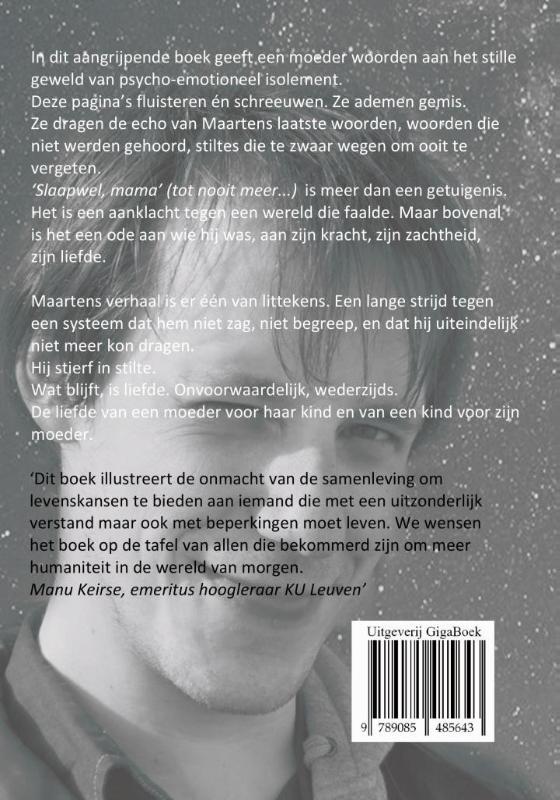 In dit aangrijpende boek geeft een moeder woorden aan het stille geweld van psycho-emotioneel isolement. Deze pagina’s fluisteren én schreeuwen. Ze ademen gemis. Ze dragen de echo van Maartens laatste woorden, woorden die niet werden gehoord, stiltes die te zwaar wegen om ooit te vergeten. ‘Slaapwel mama’; tot nooit meer is meer dan een getuigenis. Het is een aanklacht tegen een wereld die faalde. Maar bovenal is het een ode aan wie hij was, aan zijn kracht, zijn zachtheid, zijn liefde. Maartens verhaal is er één van littekens. Een lange strijd tegen een systeem dat hem niet zag, niet begreep, en dat hij uiteindelijk niet meer kon dragen. Hij stierf in stilte. Wat blijft, is liefde. Onvoorwaardelijk, wederzijds. De liefde van een moeder voor haar kind en van een kind voor zijn moeder. ‘Dit boek illustreert de onmacht van de samenleving om levenskansen te bieden aan iemand die met een uitzonderlijk verstand maar ook met beperkingen moet leven. We wensen het boek op de tafel van allen die bekommerd zijn om meer humaniteit in de wereld van morgen. Manu Keirse, emeritus hoogleraar KU Leuven’