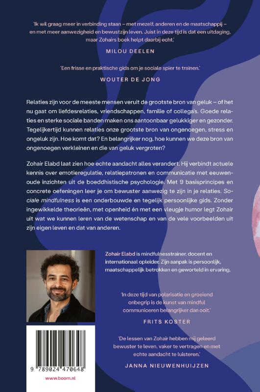 Relaties zijn voor de meeste mensen veruit de grootste bron van geluk – of het nu gaat om liefdesrelaties, vriendschappen, familie of collega’s. Goede relaties en sterke sociale banden maken ons aantoonbaar gelukkiger en gezonder. Tegelijkertijd kunnen relaties onze grootste bron van ongenoegen, stress en ongeluk zijn. Hoe komt dat? En belangrijker nog, hoe kunnen we deze bron van ongenoegen verkleinen en die van geluk vergroten? Meer verbinding door bewuste communicatie Zohair Elabd laat zien hoe echte aandacht ons helpt vriendelijker, wijzer en bewuster te communiceren. Hij verbindt eeuwenoude inzichten uit boeddhistische psychologie met actuele kennis over emotieregulatie, relatiepatronen en hedendaagse communicatiemethoden. Sociale mindfulness is een onderbouwde en tegelijk persoonlijke gids. Met onder meer 9 basisprincipes en concrete oefeningen biedt dit boek handvatten om bewuster aanwezig te zijn in relaties en zo bij te dragen aan een vriendelijkere en meer verbonden samenleving. Zonder ingewikkelde theorieën, met openheid én met een vleugje humor legt Zohair uit wat we kunnen leren van de wetenschap en van de vele voorbeelden uit zijn eigen leven en dat van anderen. Voor wie wil begrijpen wat ons drijft in communicatie bewuster, wijzer en vriendelijker wil communiceren minder automatisch wil reageren in contact meer harmonie in relaties zoekt Zohair Elabd is mindfulnesstrainer, auteur, docent en internationaal opleider. Hij ontwikkelde het programma Mindfulness Verdiepen & Mindful Communiceren (MVMC), waarmee hij mensen begeleidt naar meer verbinding – met zichzelf, anderen en de wereld. Zijn aanpak is persoonlijk, maatschappelijk betrokken en geworteld in ervaring.