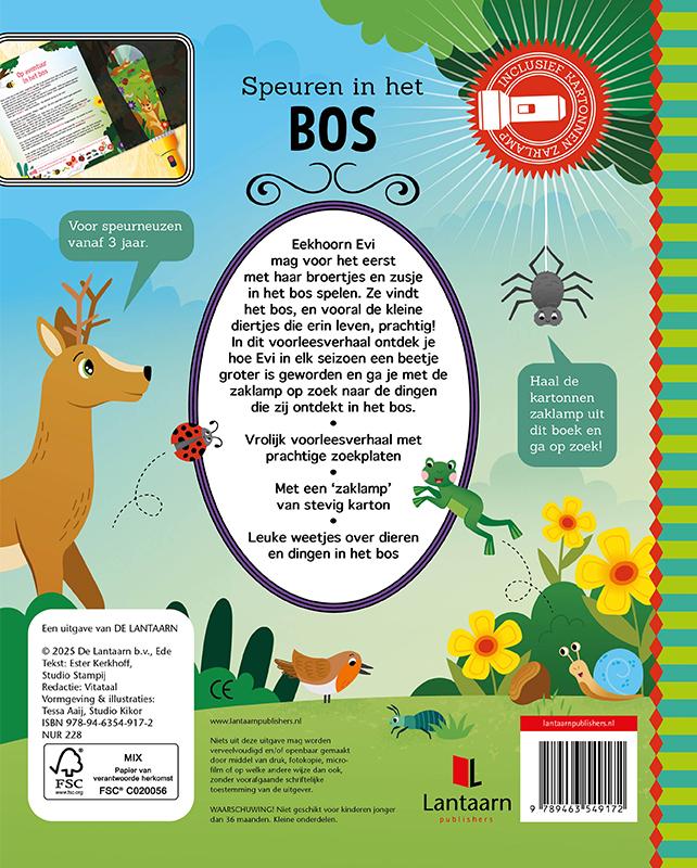 Eekhoorn Evi mag voor het eerst met haar broertjes en zusje in het bos spelen. Wat is er veel te ontdekken! Ieder seizoen ziet het bos er anders uit. Ga jij met Evi mee op avontuur? Het boek begint met leuke weetjes en feitjes over het bos. Hier kom je ook de kartonnen zaklamp tegen. Deze zaklamp heb je nodig voor de pagina's die volgen. In het verhaal staan namelijk gekleurde woorden, die je op de rechterpagina kunt zoeken. Maar dat lukt alleen als je de zaklamp gebruikt! Schuif 'm onder de zwarte pagina en je ziet dat er een lichtbundel ontstaat, waarmee je kunt zien wat Evi allemaal tijdens haar reis tegenkomt. Bekijk je ook de andere titels in deze serie?