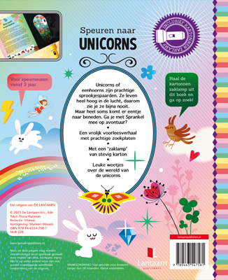 Sprankel de eenhoorn woont hoog in de lucht in een toverbos. Op een dag kukelt ze door de wolken naar beneden en verbaast zich over alles wat ze tegenkomt. Ga jij met haar mee op avontuur? Het boek begint met leuke weetjes en feitjes over eenhoorns. Hier kom je ook de kartonnen zaklamp tegen. Deze zaklamp heb je nodig voor de pagina's die volgen. In het verhaal staan namelijk gekleurde woorden, die je op de rechterpagina kunt zoeken. Maar dat lukt alleen als je de zaklamp gebruikt! Schuif 'm onder de zwarte pagina en je ziet dat er een lichtbundel ontstaat, waarmee je kunt zien wat Sprankel allemaal beleeft. Bekijk je ook de andere titels in deze serie?