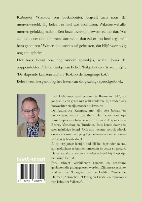 Kabouter Wiketoe, een boskabouter, begeeft zich naar de mensenwereld. Hij beleeft er heel wat avonturen. Wiketoe wil alle mensen gelukkig maken. Een boze toverkol bezwoer echter dat: 'Als een kabouter ooit een mens aanraakt, dan zal er iets heel ergs met hem gebeuren.' Wat er dan precies zal gebeuren, dat blijft voorlopig nog een geheim. Het boek bevat ook nog andere sprookjes, zoals: 'Jonas de poppendokter', 'Het sprookje van Echo', 'Rikje het zwarte konijntje', 'De slapende kaartenstad' en 'Kokibo de hongerige kok'. Beleef veel leesgenot bij het lezen van dit gezellige sprookjesboek.