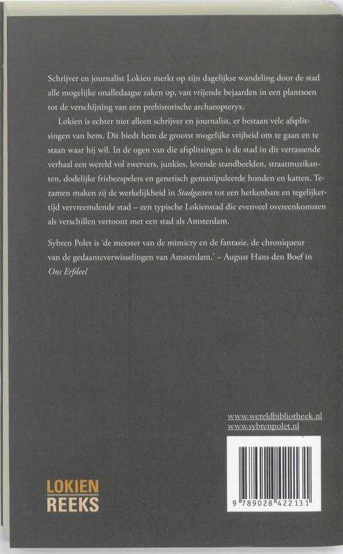 Schrijver en journalist Lokien merkt op zijn dagelijkse wandeling door de stad alle mogelijke onalledaagse zaken op, van vrijende bejaarden in een plantsoen tot de verschijning van een prehistorische archaeopteryx. Lokien is echter niet alleen schrijver en journalist, er bestaan vele afsplitsingen van hem. Dit biedt hem de grootst mogelijke vrijheid om te gaan en te staan waar hij wil. In de ogen van die afsplitsingen is de stad in dit verrassende verhaal een wereld vol zwervers, junkies, levende standbeelden, straatmuzikanten, dodelijke frisbeespelers en genetisch gemanipuleerde honden en katten. Tezamen maken zij de werkelijkheid in Stadgasten tot een herkenbare en tegelijkertijd vervreemdende stad -een typische Lokienstad die evenveel overeenkomsten als verschillen vertoont met een stad als Amsterdam.