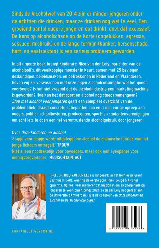 Met medewerking van o.m. KWF, Erik Scherder, Teun van der Keuken en Evi Hanssen Sinds de Alcoholwet van 2014 zijn er minder jongeren onder de achttien die drinken, maar ze drinken nog wel te veel. Een groeiend aantal oudere jongeren dat drinkt, doet dat excessief. De kans op alcoholschade op de korte (ongelukken, agressie, seksueel misbruik) en de lange termijn (kanker, hersenschade, hart- en vaatziekten) is een serieus probleem geworden.   In dit urgente boek brengt kinderarts Nico van der Lely, oprichter van de alcoholpoli’s, dit veelkoppige monster in kaart, samen met 25 bevlogen deskundigen, beleidsmakers en betrokkenen in Nederland en Vlaanderen. Geven wij als volwassenen met onze eigen alcoholconsumptie wel het goede voorbeeld? Is het niet vreemd dat de alcoholindustrie een marketingmachine is geworden? Hoe kan het dat sport en alcohol nog steeds samengaan? Stop met alcohol voor jongeren geeft een compleet overzicht van de problematiek, draagt concrete actiepunten aan en is een vurige oproep aan ouders, politici, schoolbesturen, producenten, sport- en studentenverenigingen om echt iets te doen aan het verontrustende alcoholgebruik door jongeren.