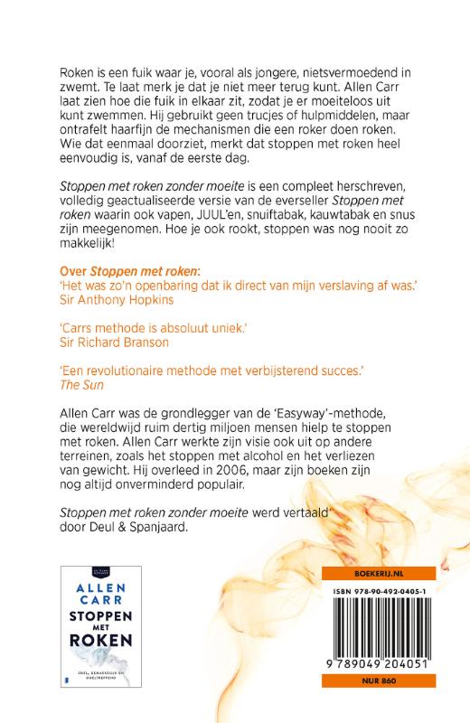 De everseller Stoppen met roken van Allen Carr is compleet herschreven en geüpdatet: nu inclusief vapen, JUUL (e-sigaretten zonder batterij), snuiftabak, kauwtabak en snus Roken is een fuik waar je, vooral als jongere, nietsvermoedend in zwemt. Te laat merk je dat je niet meer terug kunt. Allen Carr laat zien hoe die fuik in elkaar zit, zodat je er moeiteloos uit kunt zwemmen. Hij gebruikt geen trucjes of hulpmiddelen, maar ontrafelt haarfijn de mechanismen die een roker doen roken. Wie dat eenmaal doorziet, merkt dat stoppen met roken heel eenvoudig is, vanaf de eerste dag. Stoppen met roken zonder moeite is een compleet herschreven, volledig geactualiseerde versie van de everseller Stoppen met roken waarin ook vapen, JUUL’en, snuiftabak, kauwtabak en snus zijn meegenomen. Hoe je ook rookt, stoppen was nog nooit zo makkelijk! In de pers ‘Uit onderzoek blijkt dat rokers die de Allen Carr-methode volgen een bijna vier keer zo grote kans hebben om na dertien maanden nog steeds gestopt te zijn met roken.’ Prof. dr. Arie Dijkstra, Rijksuniversiteit Groningen ‘Allen Carr doorbreekt op spectaculaire wijze de mythe dat stoppen met roken moeilijk is.’ The Times ‘Het was zo’n openbaring dat ik direct van mijn verslaving af was.’ Sir Anthony Hopkins