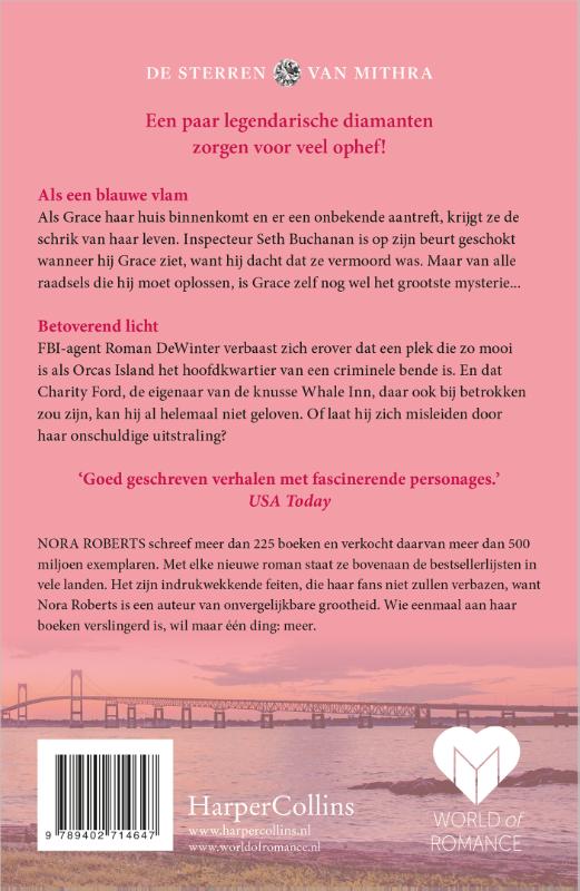 Geniet van de laatste twee delen van de schitterende serie De sterren van Mithra in Stralende sterren van bestsellerauteur Nora Roberts. Als een blauwe vlam : Als Grace haar huis binnenkomt en er een onbekende aantreft, krijgt ze de schrik van haar leven. Inspecteur Seth Buchanan is op zijn beurt geschokt wanneer hij Grace ziet, want hij dacht dat ze vermoord was. Maar van alle raadsels die hij moet oplossen, is Grace zelf nog wel het grootste mysterie... Betoverend licht : FBI-agent Roman DeWinter verbaast zich erover dat een plek die zo mooi is als Orcas Island het hoofdkwartier van een criminele bende is. En dat Charity Ford, de eigenaar van de knusse Whale Inn, daar ook bij betrokken zou zijn, kan hij al helemaal niet geloven. Of laat hij zich misleiden door haar onschuldige uitstraling?