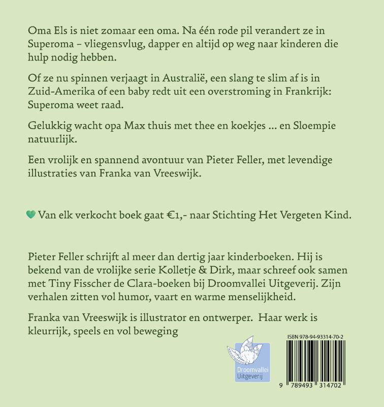 Oma Els is niet zomaar een oma. Na één rode pil verandert ze in Superoma – vliegensvlug, dapper en altijd op weg naar kinderen die hulp nodig hebben. Of ze nu spinnen verjaagt in Australië, een slang te slim af is in Zuid-Amerika of een baby redt uit een overstroming in Frankrijk: Superoma weet raad. Gelukkig wacht opa Max thuis met thee en koekjes … en Sloempie natuurlijk. Een vrolijk en spannend avontuur van Pieter Feller, met levendige illustraties van Franka van Vreeswijk.