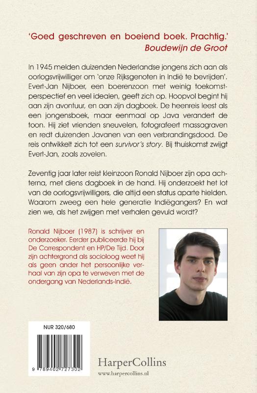 In 1945 melden duizenden Nederlandse jongens zich aan als oorlogsvrijwilliger om ‘onze Rijksgenoten in Indië te bevrijden’. Evert-Jan Nijboer, een boerenzoon met weinig toekomstperspectief en veel idealen, geeft zich op. Hoopvol begint hij aan zijn avontuur, en aan zijn dagboek. De heenreis leest als een jongensboek, maar eenmaal op Java verandert de toon. Hij ziet vrienden sneuvelen, fotografeert massagraven en redt duizenden Javanen van een verbrandingsdood. De reis ontwikkelt zich tot een survivor’s story. Bij thuiskomst zwijgt Evert-Jan, zoals zovelen. Zeventig jaar later reist kleinzoon Ronald Nijboer zijn opa achterna, met diens dagboek in de hand. Hij onderzoekt het lot van de oorlogsvrijwilligers, die altijd een status aparte hielden. Waarom zweeg een hele generatie Indiëgangers? En wat zien we, als het zwijgen met verhalen gevuld wordt? Over Tabé Java, Tabé Indië: ‘Goed geschreven en boeiend boek. Prachtig.’ – Boudewijn de Groot