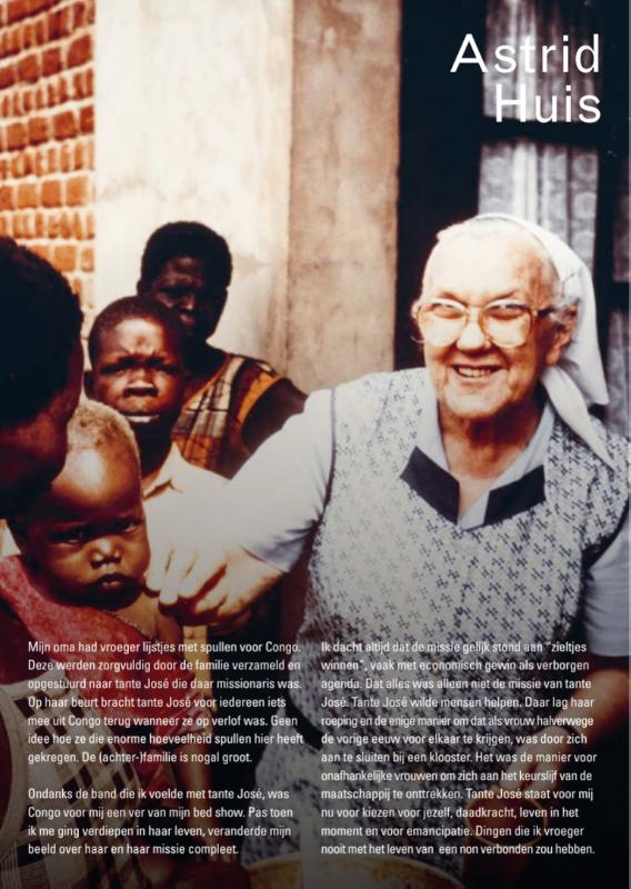 Mijn oma had vroeger lijstjes met spullen voor Congo. Deze werden zorgvuldig door de familie verzameld en opgestuurd naar tante José die daar missionaris was. Op haar beurt bracht tante José voor iedereen iets mee uit Congo terug wanneer ze op verlof was. Geen idee hoe ze die enorme hoeveelheid spullen hier heeft gekregen. De (achter-)familie is nogal groot. Ondanks de band die ik voelde met tante José, was Congo voor mij een ver van mijn bed show. Pas toen ik me ging verdiepen in haar leven, veranderde mijn beeld over haar en haar missie compleet. Ik dacht altijd dat de missie gelijk stond aan "zieltjes winnen", vaak met economisch gewin als verborgen agenda. Dat alles was alleen niet de missie van tante José. Tante José wilde mensen helpen. Daar lag haar roeping en de enige manier om dat als vrouw halverwege de vorige eeuw voor elkaar te krijgen, was door zich aan te sluiten bij een klooster. Het was de manier voor onafhankelijke vrouwen om zich aan het keurslijf van de maatschappij te onttrekken. Tante José staat voor mij nu voor het kiezen voor jezelf, daadkracht, leven in het moment en voor emancipatie. Dingen die ik vroeger nooit met het leven van een non verbonden zou hebben.