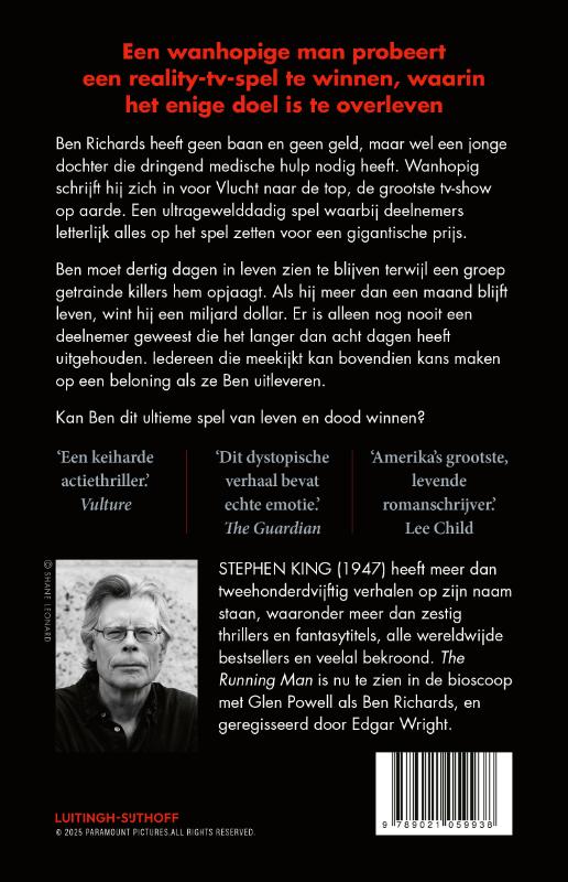 In Vlucht naar de top van Stephen King vallen De Hongerspelen en Squid Game in het niet bij de gruwelijke wedstrijd waar Ben Richards in terechtkomt… Dit najaar te zien in de bioscoop als The Running Man. Op jacht naar hoge kijkcijfers worden er steeds extremere televisiespelletjes bedacht. Kandidaten genoeg: de werkloosheid is hoog en uitkeringen zijn er niet. Ben Richards, achtentwintig jaar, is de wanhoop nabij. Zijn dochtertje is ziek en geld om medicijnen te kopen heeft hij niet. Ben schrijft zich in als kandidaat voor het spel Vlucht naar de top. Hoofdprijs: één miljard dollar. Het spel: een jacht op leven en dood… King schreef Vlucht naar de top onder zijn pseudoniem Richard Bachman. Het werd in 1987 verfilmd door Paul Michael Glaser met o.a. Arnold Schwarzenegger in de hoofdrol. Een nieuwe film met Glen Powell in de hoofdrol is in de maak onder regie van Edgar Wright.