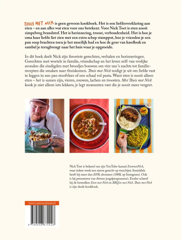 Thuis met Nick is geen gewoon kookboek. Het is een liefdesverklaring aan eten - en aan alles wat eten voor ons betekent. Voor Nick Toet is eten nooit simpelweg brandstof. Het is herinnering, troost, verbondenheid. Het is hoe je oma haar liefde liet zien met een extra schep stamppot, hoe je vrienden je een pan soep brachten toen je het moeilijk had en hoe de geur van knoflook en sambal je terugbrengt naar het huis waar je opgroeide. In dit boek deelt Nick zijn favoriete gerechten, verhalen en herinneringen. Gerechten met wortels in familie, vriendschap en het leven zelf: van vrolijke avonden die eindigden met broodjes bouwen om vier uur 's nachts tot familierecepten die smaken naar thuiskomen. Thuis met Nick nodigt je uit om liefde vast te leggen in een pan stoofvlees of een schaal vol pasta. Want eten is nooit alleen eten - het is samen zijn, vieren, rouwen, lachen en troosten. Met Thuis met Nick kook je niet alleen iets lekkers; je legt momenten vast die je nooit meer vergeet.