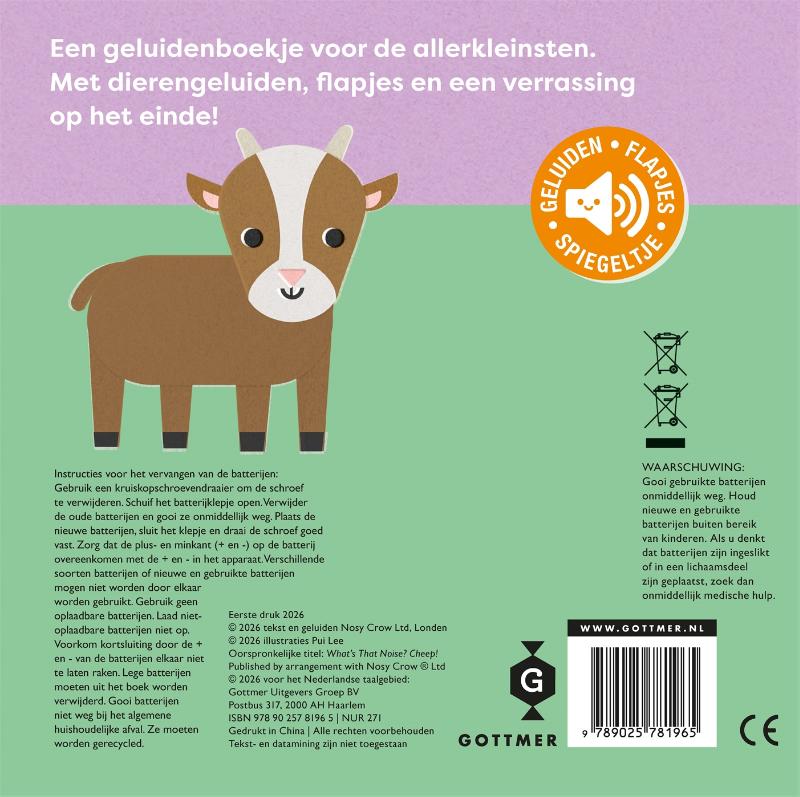 Het leukste geluidenboekje met kinderboerderijdieren voor kindjes vanaf 1 jaar! ‘Wat hoor ik daar? – Tjiep!’ is een innovatief en interactief flapjesboek dat perfect is voor nieuwsgierige dreumesen. In dit kartonboekje met het thema kinderboerderij hoor je vijf verschillende dierengeluiden. Luister samen naar het geluid, raad welk dier zich verstopt en til het flapje op om te zien welk boerderijdier het is! Was het een eendje, een geitje, een konijntje of een kuikentje? Als verrassing aan het einde: een geluidje en een spiegel waarin je kindje zichzelf kan zien! Pui Lee is een freelance illustrator en grafisch ontwerper uit Londen. Met een speelse en grafische benadering maakt ze gebruik van eenvoudige vormen, structuren en kleuren. Ze illustreert graag alledaagse objecten en experimenteert met texturen en patronen om een verhaal te vertellen. ‘Wat hoor ik daar? – Tjiep!’ is zonder twijfel het leukste dierenboekje met geluiden om spelenderwijs kennis te maken met de kinderboerderij. Geschikt voor kindjes vanaf 12 maanden. Ook verkrijgbaar in de serie Wat hoor ik daar? zijn: ‘Wat hoor ik daar? – Miauw!’, ‘Wat hoor ik daar? – Boe!’ en ‘Wat hoor ik daar? – Brul!’