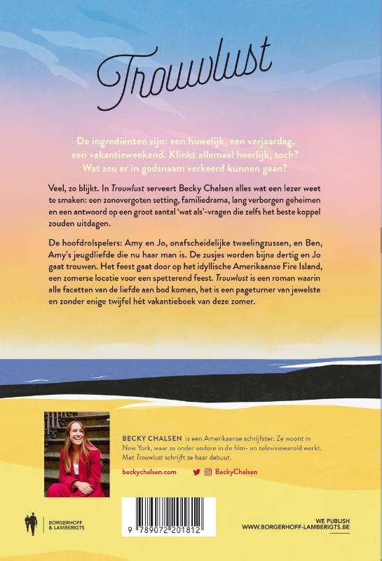 De ingrediënten zijn: een huwelijk, een verjaardag, een vakantieweekend. Klinkt allemaal heerlijk, toch? Wat zou er in godsnaam verkeerd kunnen gaan? Veel, zo blijkt. In Trouwlust serveert debutante en influencer Becky Chalsen alles wat een lezer weet te smaken: een zonovergoten setting, familiedrama, lang verborgen geheimen en een antwoord op een groot aantal ‘Wat als-vragen’ die zelfs het beste koppel zouden uitdagen. De hoofdrolspelers: Amy en Jo, de onafscheidelijke Sharp tweeling en Ben, Amy’s kinderliefde die nu haar man is. De zusjes worden bijna dertig en Jo gaat trouwen. Het feest gaat door op het idyllische Amerikaanse Fire Island, en het hele stadje Kismet is er bij betrokken. Een zomerse locatie voor een spetterend feest. Trouwlust is een roman waar alle facetten van de liefde in aan bod komen, het is een pageturner van jewelste en zonder enige twijfel hét vakantieboek van deze zomer.