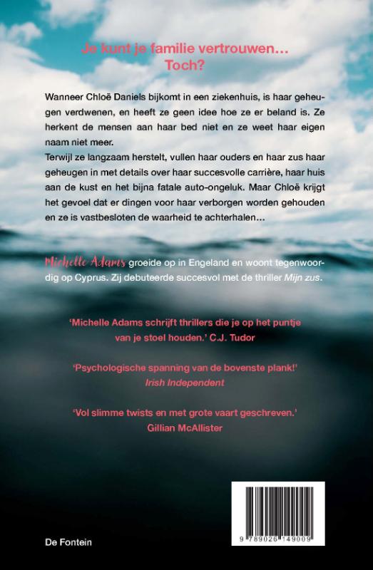 Michelle Adams schreef na Mijn zus haar tweede thriller, Tussen de leugens ( Between the Lies ). Chloë Daniels komt bij in een ziekenhuis, haar geheugen verdwenen, geen idee hoe ze er beland is. Ze herkent de mensen aan haar bed niet, ze weet haar eigen naam niet. Terwijl ze langzaam herstelt, vullen haar ouders en haar zus haar geheugen in met details over haar succesvolle carrière, haar huis aan de kust en het bijna fatale auto-ongeluk. Maar Chloë krijgt het gevoel dat ze dingen voor haar verborgen houden en ze is vastbesloten de waarheid te achterhalen… Michelle Adams groeide op in Engeland en woont tegenwoordig op Cyprus. Voor de fans van S.J. Watson en Clare Mackintosh!