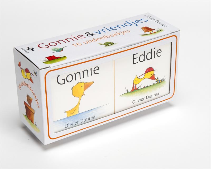 'Gonnie & vriendjes uitdeelboekjes' is een set van maar liefst 16 uitdeelboekjes voor dreumesen en peuters vanaf 2 jaar. Trakteren maar! Sinds Gonnie en Gijsje de Nederlandse boekhandel binnenwaggelden, zijn de gansjes en hun vriendjes waanzinnig populair bij peuters. Hoog tijd dus om alle vriendjes en vriendinnetjes mee te laten genieten van hun avonturen! In deze vrolijke uitdeeldoos zitten 16 miniboekjes over Gonnie, Gijsje en hun vriendjes: 4 verschillende boekjes met elk 4 verschillende titels. Superleuk om als cadeautje, bedankje of traktatie uit te delen op een kinderverjaardag - of om gewoon lekker zelf te houden. Gonnie en haar vriendjes zijn al meer dan 15 jaar favoriet bij Nederlandse en Vlaamse peuters. De populaire serie van Olivier Dunrea is namelijk niet alleen leuk, maar ook nog eens leerzaam. Een gouden combinatie voor peuters!