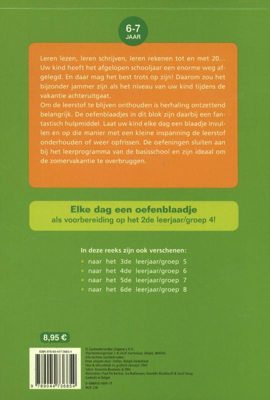 Leren lezen, leren schrijven, leren rekenen tot en met 20… Uw kind heeft het afgelopen schooljaar een enorme weg afgelegd. En daar mag het best trots op zijn! Daarom zou het bijzonder jammer zijn als het niveau van uw kind tijdens de vakantie achteruitgaat. Om de leerstof te blijven onthouden is herhaling ontzettend belangrijk. De oefenblaadjes in dit blok zijn daarbij een fantastisch hulpmiddel. Laat uw kind elke dag een blaadje invullen en op die manier met een kleine inspanning de leerstof onderhouden of weer opfrissen. De oefeningen sluiten aan bij het leerprogramma van de basisschool en zijn ideaal om de zomervakantie te overbruggen.