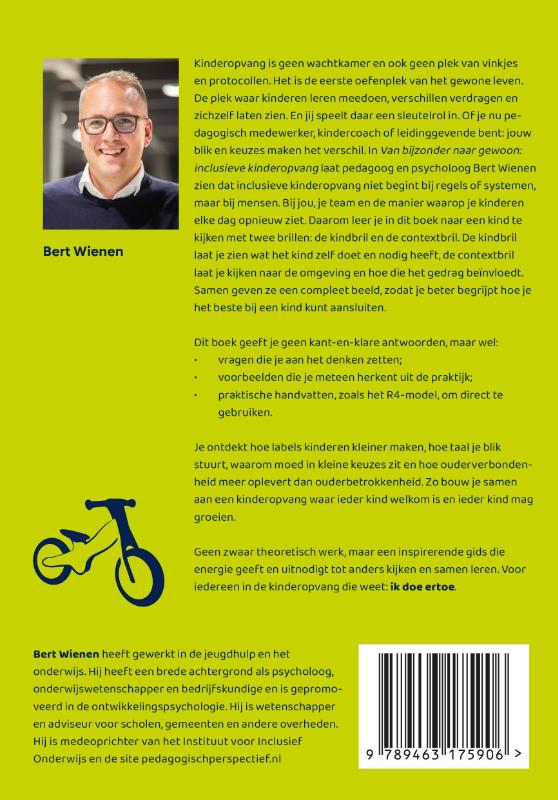 Kinderopvang is geen wachtkamer en ook geen plek van vinkjes en protocollen. Het is de eerste oefenplek van het gewone leven. De plek waar kinderen leren meedoen, verschillen verdragen en zichzelf laten zien. En jij speelt daar een sleutelrol in. Of je nu pedagogisch medewerker, kindercoach of leidinggevende bent: jouw blik en keuzes maken het verschil. In 'Van bijzonder naar gewoon: inclusieve kinderopvang' laat pedagoog en psycholoog Bert Wienen zien dat inclusieve kinderopvang niet begint bij regels of systemen, maar bij mensen. Bij jou, je team en de manier waarop je kinderen elke dag opnieuw ziet. Daarom leer je in dit boek naar een kind te kijken met twee brillen: de kindbril en de contextbril. De kindbril laat je zien wat het kind zelf doet en nodig heeft, de contextbril laat je kijken naar de omgeving en hoe die het gedrag beïnvloedt. Samen geven ze een compleet beeld, zodat je beter begrijpt hoe je het beste bij een kind kunt aansluiten. Dit boek geeft je geen kant-en-klare antwoorden, maar wel: • vragen die je aan het denken zetten; • voorbeelden die je meteen herkent uit de praktijk; • praktische handvatten, zoals het R4-model, om direct te gebruiken. Je ontdekt hoe labels kinderen kleiner maken, hoe taal je blik stuurt, waarom moed in kleine keuzes zit en hoe ouderverbondenheid meer oplevert dan ouderbetrokkenheid. Zo bouw je samen aan een kinderopvang waar ieder kind welkom is en ieder kind mag groeien. Geen zwaar theoretisch werk, maar een inspirerende gids die energie geeft en uitnodigt tot anders kijken en samen leren. Voor iedereen in de kinderopvang die weet: ik doe ertoe.