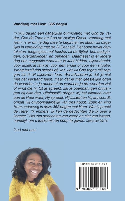 Vandaag met Hem, 365 dagen. In 365 dagen een dagelijkse ontmoeting met God de Vader, God de Zoon en God de Heilige Geest. Vandaag met Hem; is er om je dag mee te beginnen en staan wij dagelijks in verbinding met de 3- Eenheid. Het boek bevat dag teksten, toegespitst met teksten uit de Bijbel, bemoedigingen, overdenkingen en gebeden. Daarnaast is er iedere dag een suggestie waarvoor je kunt bidden, bijvoorbeeld; voor jezelf, je familie, voor een ander of voor een situatie. Vraag jezelf dan steeds af, van wat wil God tegen mij zeggen als ik dit Bijbelvers lees. We adviseren je dat je niet met het verstand leest, maar dat je met geestelijke ogen de woorden in je opneemt en wanneer je de woorden ziet of vindt die hij tot je spreekt, zal je openbaringen ontvangen bij elke dag. Uiteindelijk dragen wij het allemaal over aan de Heer want, Hij spreekt, Hij luistert en Hij antwoordt, omdat Hij onvoorwaardelijk van ons houdt. Zoek en vind Hem onderweg in deze 365 dagen met Hem. Want spreekt de Here: “Ik immers, Ik ken de gedachten die Ik over u koester." Het zijn gedachten van vrede en niet van kwaad, namelijk om u toekomst en hoop te geven. ( Jeremia 29:11) God met ons!