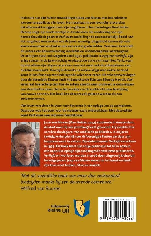 In de tuin van zijn huis in Hawaii begint Jaap van Manen met het schrijven van een terugblik op zijn leven. Het resultaat is een levendig reisverslag dat allereerst teruggaat naar zijn jeugdjaren in het naoorlogse Den Helder. Daarop volgt zijn studententijd in Amsterdam. De ontdekking van zijn homoseksualiteit geeft in Veel leven aanleiding tot een aanstekelijk beeld van het zorgeloze Amsterdam van de jaren zeventig. Uitgebreid komen zijn vele kleine romances aan bod en ook een aantal grote liefdes. Veel leven beschrijft dit proces van bewustwording van liefde en vriendschap heel overtuigend. De schrijver staat ook uitgebreid stil bij de publicatie in 1979 van Verliefd, zijn enige roman. In de jaren tachtig verplaatst de actie zich naar New York, waar hij niet alleen zijn uitgeverscarrière voortzet maar ook de Aidsepidemie van dichtbij meemaakt. Hoe hij in Amerika te maken krijgt met ziekte en dood komt in Veel leven op zeer indringende wijze naar voren. Na vele omzwervingen door de Verenigde Staten vindt hij tenslotte de Tuin van Eden op Hawaii. Veel leven laat haarscherp zien hoe de auteur steeds weer probeert te ontsnappen aan kleinheid en sleur. Het is het verslag van de zoektocht naar bevrijding van nauwe normen. Het boek kan daarom ook gelezen worden als een schelmenroman. Veel leven verscheen in 2020 voor het eerst in een oplage van 25 exemplaren. Daardoor was het boek voor de meeste lezers onbereikbaar. Met deze editie komt Veel leven voor iedereen beschikbaar.