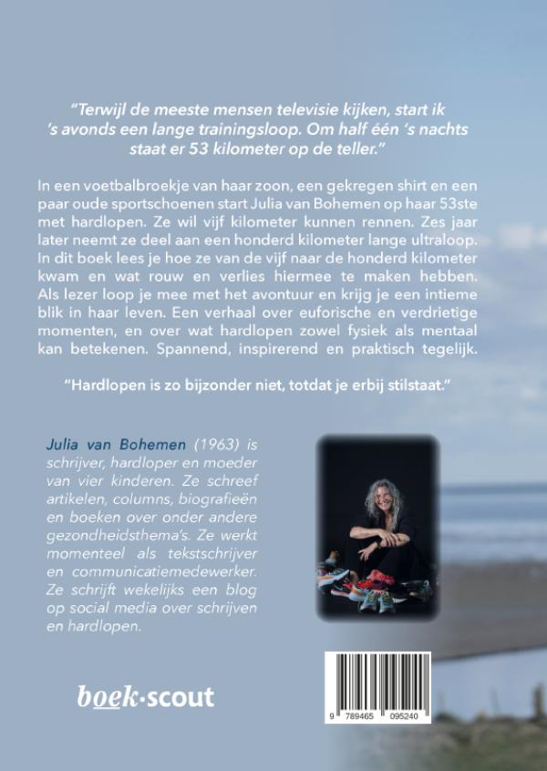 “Terwijl de meeste mensen televisie kijken, start ik ’s avonds een lange trainingsloop. Om half één 's nachts staat er 53 kilometer op de teller." In een voetbalbroekje van haar zoon, een gekregen shirt en een paar oude sportschoenen start Julia van Bohemen op haar 53ste met hardlopen. Ze wil vijf kilometer kunnen rennen. Zes jaar later neemt ze deel aan een honderd kilometer lange ultraloop. In dit boek lees je hoe ze van de vijf naar de honderd kilometer kwam en wat rouw en verlies hiermee te maken hebben. Als lezer loop je mee met het avontuur en krijg je een intieme blik in haar leven. Een verhaal over euforische en verdrietige momenten, en over wat hardlopen zowel fysiek als mentaal kan betekenen. Spannend, inspirerend en praktisch tegelijk. “Hardlopen is zo bijzonder niet, totdat je erbij stilstaat.”