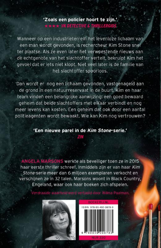 De steengoede, verslavende thrillerserie voor de fans van Robert Bryndza, M.J. Arlidge en Carla Kovach Wanneer het levenloze lichaam van een man wordt gevonden op een industrieterrein, is rechercheur Kim Stone snel ter plaatse. Als ze even later het verwoestende nieuws aan de echtgenote van het slachtoffer vertelt, bekruipt Kim het gevoel dat er iets niet klopt. Vierentwintig uur later is de familie van het slachtoffer spoorloos. Dan wordt er een tweede lichaam gevonden, vastgespijkerd aan de grond in een natuurreservaat in de buurt. Kim en haar team vinden een belangrijke aanwijzing: een goed bewaard geheim dat beide slachtoffers met elkaar verbindt en nog meer levens kan kosten. Een geheim dat ook door een aantal politieagenten wordt bewaakt. Over de boeken van Angela Marsons: ‘Deze reeks is echt een aanrader voor elke thrillerverslaafde.’ **** ThrillZone.nl ‘Een vrouwelijke auteur die het gruwelijke en het macabere niet schuwt, zonder haar weg in haar plot te verliezen.’ Gazet van Antwerpen ‘Deze thriller is goed voor een doorwaakte nacht en heeft een detective naar je hart. Graag meer Kim Stone!’ Libelle