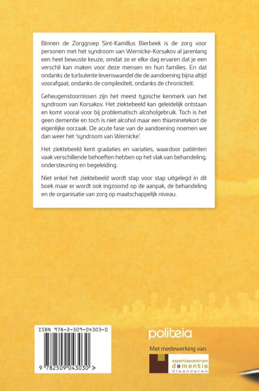 Binnen de Zorggroep Sint-Kamillus Bierbeek is de zorg voor personen met het syndroom van Wernicke-Korsakov al jarenlang een heel bewuste keuze, omdat ze er elke dag ervaren dat je een verschil kan maken voor deze mensen en hun families. En dat ondanks de turbulente levenswandel die de aandoening bijna altijd voorafgaat, ondanks de complexiteit, ondanks de chroniciteit. Geheugenstoornissen zijn het meest typische kenmerk van het syndroom van Korsakov. Het ziektebeeld kan geleidelijk ontstaan en komt vooral voor bij problematisch alcoholgebruik. Toch is het geen dementie en toch is niet alcohol maar een thiaminetekort de eigenlijke oorzaak. De acute fase van de aandoening noemen we dan weer het ‘syndroom van Wernicke’. Het ziektebeeld kent gradaties en variaties, waardoor patiënten vaak verschillende behoeften hebben op het vlak van behandeling, ondersteuning en begeleiding. Niet enkel het ziektebeeld wordt stap voor stap uitgelegd in dit boek maar er wordt ook ingzoomd op de aanpak, de behandeling en de organisatie van zorg op maatschappelijk niveau.