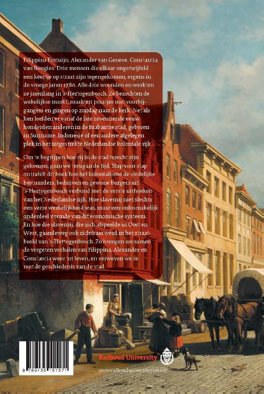 Filippina Fortuijn. Alexander van Geneve. Constantia van Bougies. Drie mensen die elkaar ongetwijfeld een keertje op straat zijn tegengekomen, ergens in de vroege jaren 1780. Alle drie woonden en werkten ze jarenlang in ’s-Hertogenbosch. Ze bezochten de wekelijkse markt, maakten praatjes met voorbijgangers en gingen op zondag naar de kerk. Net als hen leefden er vanaf de late zeventiende eeuw honderden anderen in de Brabantse stad, geboren in Suriname, Indonesië of een andere afgelegen plek in het uitgestrekte Nederlandse koloniale rijk. Om te begrijpen hoe zij in de stad terecht zijn gekomen, gaan we terug in de tijd. Stap voor stap ontrafelt dit boek hoe het kolonialisme de stedelijke bestuurders, bedrijven en gewone burgers uit ’s-Hertogenbosch verbond met de verste uithoeken van het Nederlandse rijk. Hoe slavernij niet slechts een verre werkelijkheid was, maar een onlosmakelijk onderdeel vormde van dit economische systeem. En hoe die slavernij, die zich afspeelde in Oost en West, gaandeweg ook zichtbaar werd in het straatbeeld van ’s-Hertogenbosch. Zo brengen we samen de vergeten verhalen van Filippina, Alexander en Constantia weer tot leven, en verweven we ze met de geschiedenis van de stad.