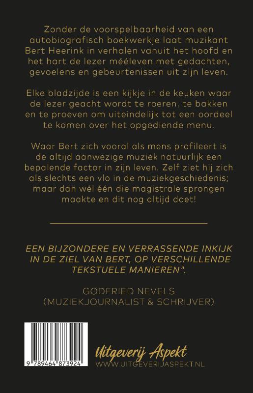 Zonder de voorspelbaarheid van een autobiografisch boekwerkje laat muzikant Bert Heerink in verhalen vanuit het hoofd en het hart de lezer mééleven met gedachten, gevoelens en gebeurtenissen uit zijn leven. Elke bladzijde is een kijkje in de keuken waar de lezer geacht wordt te roeren, te bakken en te proeven om uiteindelijk tot een oordeel te komen over het opgediende menu. Waar Bert zich vooral als mens profileert is de altijd aanwezige muziek natuurlijk een bepalende factor in zijn leven. Zelf ziet hij zich als slechts een vlo in de muziekgeschiedenis; maar dan wél één die magistrale sprongen maakte en dit nog altijd doet! Een bijzondere en verrassende inkijk in de ziel van Bert, op verschillende tekstuele manieren". Godfried Nevels (muziekjournalist & schrijver)