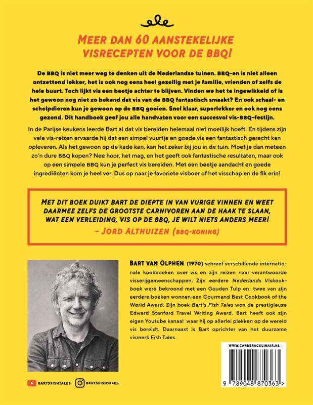 De BBQ is niet meer weg te denken uit de Nederlandse tuinen. BBQ-en is niet alleen ontzettend lekker, het is ook nog eens heel gezellig met je familie, vrienden of zelfs de hele buurt. Toch lijkt vis een beetje achter te blijven. Vinden we het te ingewikkeld of is het gewoon nog niet zo bekend dat vis van de BBQ fantastisch smaakt? En ook schaal- en schelpdieren kun je gewoon op de BBQ gooien. Snel klaar, superlekker en ook nog eens gezond. Dit handboek geeft jou alle handvatten voor een succesvol vis-BBQ-festijn. In de Parijse keukens leerde Bart al dat vis bereiden helemaal niet moeilijk hoeft te zijn. En tijdens zijn vele vis-reizen ervaarde hij dat een simpel vuurtje en goede vis een fantastisch gerecht kan opleveren. Als het gewoon op de kade kan, kan het zeker bij jou in de tuin. Moet je dan meteen zo'n dure BBQ kopen? Nee hoor, het mag, en het geeft ook fantastische resultaten, maar ook op een simpele BBQ kun je perfect vis bereiden. Met een beetje aandacht en goede ingrediënten kom je heel ver. Dus op naar je favoriete visboer of het visschap en de fik erin!