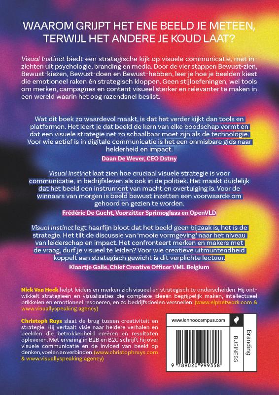 Waarom grijpt het ene beeld je meteen, terwijl het andere je koud laat? Visual Instinct biedt een strategische kijk op visuele communicatie, met inzichten uit psychologie, branding en media. Door de vier stappen Bewust-zien, Bewust-kiezen, Bewust-doen en Bewust-hebben, leer je hoe je beelden kiest die emotioneel raken én strategisch kloppen. Geen stijloefeningen, wel tools om merken, campagnes en content visueel sterker en relevanter te maken in een wereld waarin het oog razendsnel beslist. 'Wat dit boek zo waardevol maakt, is dat het verder kijkt dan tools en platformen. Het leert je dat beeld de kern van elke boodschap vormt en dat een visuele strategie net zo schaalbaar moet zijn als de technologie. Voor wie actief is in digitale communicatie is het een onmisbare gids naar helderheid en impact.' - Daan De Wever, CEO Dstny 'Visual Instinct laat zien hoe cruciaal visuele strategie is voor communicatie, in bedrijfsleven als ook in de politiek. Het maakt duidelijk dat het beeld een instrument van macht en overtuiging is. Voor de winnaars van morgen is beeld bewust inzetten een voorwaarde om gehoord en gezien te worden.' - Frédéric De Gucht, Voorzitter Sprimoglass en OpenVLD 'Visual Instinct legt haarfijn bloot dat het beeld geen bijzaak is, het Ãs de strategie. Het tilt de discussie van 'mooie vormgeving' naar het niveau van leiderschap en impact. Het confronteert merken en makers met de vraag, durf je visueel te leiden? Voor wie creatieve uitmuntendheid koppelt aan strategisch gewicht is dit verplichte lectuur.' - Klaartje Galle, Chief Creative Officer VML Belgium