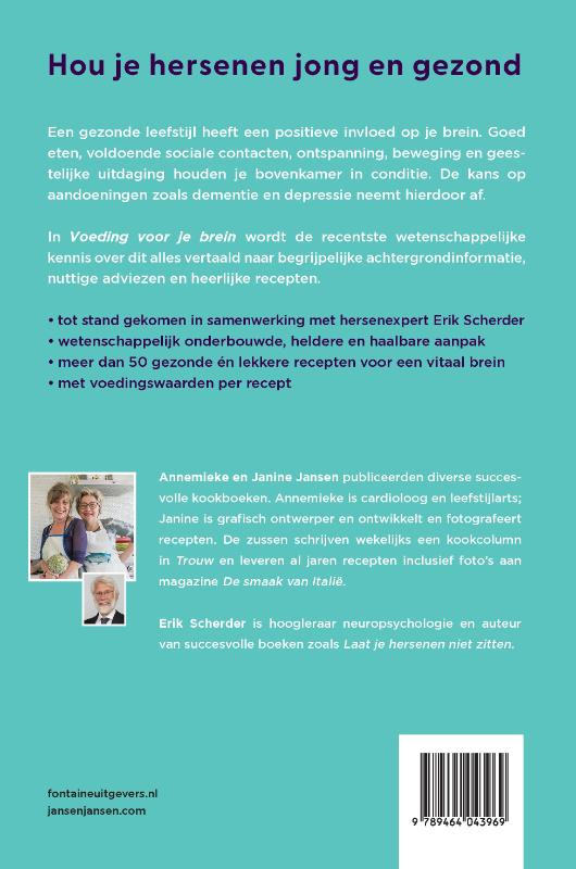 Hét kookboek voor wie zijn hersenen gezond wil houden Een gezonde leefstijl is van invloed op de gezondheid van je brein. Cardioloog Annemieke en receptenmaker-vormgever Janine Jansen laten samen met professor Erik Scherder zien hoe je met een eenvoudig én lekker eetpatroon je hersenen jong kunt houden. Weloverwogen keuzes op het gebied van eten, ontspannen en bewegen dragen bij aan het verbeteren van cognitieve prestaties en verlagen het risico op hersenaandoeningen zoals dementie en depressie. In Voeding voor je brein wordt de meest recente wetenschappelijke kennis hierover vertaald naar begrijpelijke informatie, concrete acties en heerlijke recepten. Met de juiste voeding, voldoende rust en beweging, weinig stress en veel plezierige geestelijke uitdaging kun je je bovenkamer beter laten functioneren. • Met toegankelijke, wetenschappelijk onderbouwde uitleg over de werking van het brein en de invloed van leefstijl daarop • Meer dan 55 gezonde én smakelijke recepten die passen binnen de mediterrane leefstijl • Met voedingswaarden bij elk recept De pers over de auteurs en eerdere boeken: ‘Erik Scherder schudt je wakker!’ Psychologie Magazine Over CholesteroI van Annemieke en Janine Jansen: ‘Het is helemaal niet zo moeilijk om gezonder te eten.’ Santé ‘Een inspirerend boek [...]. De recepten zijn gevarieerd en creatief.’ Trouw
