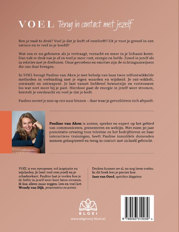 VOEL, terug in contact met jezelf Ben je vaak te druk? Voel je dat je leeft of overleeft? Zit je voor je gevoel in een ratrace en te veel in je hoofd? Wat zou er nu gebeuren als je vertraagt, verzacht en meer in je lichaam komt. Dan valt er druk van je af en voel je meer rust, energie en liefde. Zowel in jezelf als in relaties met je dierbaren. Onze gevoelens en emoties zijn de richtingaanwijzers die ons daar brengen. In VOEL brengt Pauline van Aken je met behulp van haar twee zelfontwikkelde methoden in verbinding met je eigen waarden en wijsheid. Je ont-wikkelt, ontwaakt en ontwapent. Je laat vanuit liefdevol bewustzijn en vertrouwen los wat niet meer bij je past. Hierdoor gaat de energie in jezelf weer stromen, herstelt je veerkracht en voel je dat je leeft. Pauline neemt je mee op reis naar binnen – daar waar je gevoelsleven zich afspeelt. VOEL bevat inspirerende en zeer waardevolle lessen, waardoor je niet alleen jezelf nog beter leert kennen… Je groeit erdoor in je bewustzijn, eigenwaarde en zelfvertrouwen. Met de praktische oefeningen voor in het dagelijks leven, breng je jezelf gemakkelijk op een hoger plan, ook op het gebied van gezondheid en welzijn. Wat Wendy van Dijk en Inez van Oord zeggen over VOEL: Wendy van Dijk, presentatrice en actrice “VOEL is een eyeopener, vol inspiratie en wijsheden. Je leert veel over jezelf en je schaduwkant. Pauline laat je voelen hoe je de liefde in jezelf weer kunt laten stromen. Ik kan alleen maar zeggen: lees en voel het.” Inez van Oord, oprichter Happinez “Denken kunnen we al, nu nog leren voelen. In dit boek lees je precies hoe.” Auteur: Pauline van Aken Pauline is auteur, presentator/spreker en expert op het gebied van communiceren, presenteren en welzijn. Ze presenteerde onder andere tv-programma’s voor SBS, waaronder Hart van Nederland, Actie Nieuws en Start op 6. Ruim 25 jaar lang is zij de stem geweest van Nick Junior, de peuter/kleuterzender van Nickelodeon. Met ruim 30 jaar presentatie-ervaring voor televisie en het bedrijfsleven, haar diverse boeken en interactieve trainingen, heeft Pauline inmiddels duizenden mensen geïnspireerd en terug in contact gebracht met zichzelf. Pauline is ook de auteur van: Durf, leer en presenteer, Present Yourself with Power, Presenteren is leuk, voor kinderen uit groep 7 en 8 en hun opvoeders en leerkrachten en van het audioboek: Wat wil je nou eigenlijk zeggen, je bent zoveel meer dan je hoofd alleen.
