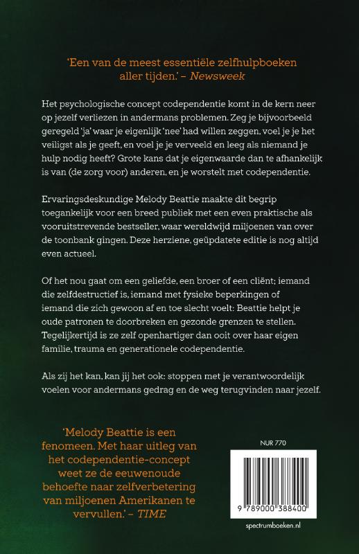 De Nederlandse vertaling van Codependent No More – een moderne klassieker die al miljoenen lezers hielp ‘Een van de meest essentiële zelfhulpboeken aller tijden.’ Newsweek Het psychologische concept codependentie komt in de kern neer op jezelf verliezen in andermans problemen. Zeg je bijvoorbeeld geregeld ‘ja’ waar je eigenlijk ‘nee’ had willen zeggen, voel je je het veiligst als je geeft, en voel je je verveeld en leeg als niemand je hulp nodig heeft? Grote kans dat je eigenwaarde dan te afhankelijk is van (de zorg voor) anderen, en je worstelt met codependentie. Ervaringsdeskundige Melody Beattie maakte dit begrip toegankelijk voor een breed publiek met een even praktische als vooruitstrevende bestseller, waar wereldwijd miljoenen van over de toonbank gingen. Deze herziene, geüpdatete editie is nog altijd even actueel. Of het nou gaat om een geliefde, een broer of een cliënt; iemand die zelfdestructief is, iemand met fysieke beperkingen of iemand die zich gewoon af en toe slecht voelt: Beattie helpt je oude patronen te doorbreken en gezonde grenzen te stellen. Tegelijkertijd is ze zelf openhartiger dan ooit over haar eigen familie, trauma en generationele codependentie. Als zij het kan, kan jij het ook: stoppen met je verantwoordelijk voelen voor andermans gedrag en de weg terugvinden naar jezelf. ‘Melody Beattie is een fenomeen. Met haar uitleg van het codependentie-concept weet ze de eeuwenoude behoefte naar zelfverbetering en wedergeboorte van miljoenen Amerikanen te vervullen.’ TIME Melody Beattie (1948) is een Amerikaanse auteur wier leven is getekend door alcoholisme. Eerst doordat ze op zeer jonge leeftijd zelf verslaafd raakt, daarna doordat ze, eenmaal afgekickt, in een relatie terechtkomt met een zware alcoholist. Uiteindelijk weet ze hieruit te komen, waarna ze meerdere bestsellers schrijft. Met de eerste, Codependent No More , brengt ze in 1986 het concept codependentie – dat door psychiater Timmen L. Cermak in wetenschappelijke kringen was geïntroduceerd – naar het grote publiek.