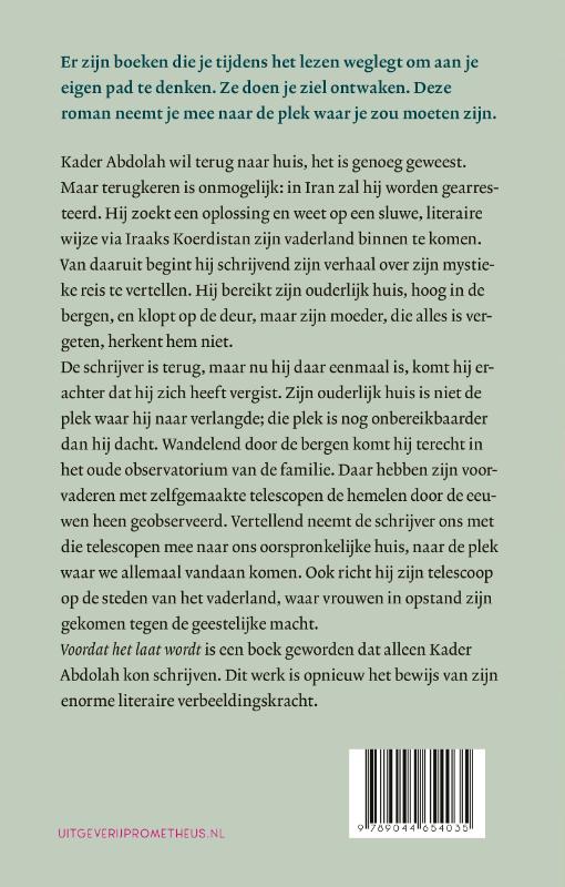 Er zijn boeken die je tijdens het lezen weglegt om aan je eigen pad te denken. Ze doen je ziel ontwaken. Deze roman neemt je mee naar de plek waar je zou moeten zijn. Kader Abdolah wil terug naar huis, het is genoeg geweest. Maar terugkeren is onmogelijk: in Iran zal hij worden gearresteerd. Met een vals paspoort en onder een andere naam weet hij op sluwe wijze via Iraaks Koerdistan zijn vaderland binnen te komen en hij bereikt zijn ouderlijk huis, hoog in de bergen; maar zijn moeder, die alles is vergeten, herkent hem niet. Kader Abdolah is terug, maar nu hij daar eenmaal is, komt hij erachter dat hij zich heeft vergist. Zijn ouderlijk huis was niet de plaats waarnaar hij verlangde: die plaats was nog onbereikbaarder dan hij dacht. Wandelend door de bergen en langs ravijnen komt hij terecht in het oude observatorium van de familie. Daar hebben zijn voorvaderen met zelfgemaakte telescopen de hemelen door de eeuwen heen geobserveerd. De schrijver neemt ons met die telescopen mee naar ons oorspronkelijke thuis, naar de plek waar we allemaal vandaan komen. Ook richt hij zijn kijker op de steden van het vaderland, waar vrouwen in opstand zijn gekomen tegen de geestelijke macht. Met Voordat het laat wordt snijdt Kader Abdolah een belangrijk thema van deze tijd aan. Het is een boek dat alleen hij kon schrijven. Dit werk is opnieuw het bewijs van zijn enorme literaire verbeeldingskracht. Kader Abdolah (Iran, 1954) is niet alleen de schrijver van grote romans als Het huis van de moskee , Salam Europa! (longlist ECI Literatuurprijs 2017) en Op zoek naar Ramona , maar ook de vertaler en bezorger van grote klassieke meesterwerken uit de wereldliteratuur, zoals De Koran , 1001 nacht en Wat je zoekt, zoekt jou , die in Nederland heel succesvol waren. Over Wat je zoekt, zoekt jou : ‘Kader Abdolah duwt de deur naar de Perzische cultuur steeds een stukje verder open.’ Ariejan Korteweg, De Volkskrant ‘Abdolah spreekt over Rumi als de Shakespeare van de oosterse wereld.’ Somajeh Ghaeminia, Trouw ‘Abdolah reconstrueerde Rumi’s levensloop. En dat doet de auteur op de voor hem bekende manier: kort maar krachtig en in beeldend Nederlands.’ Lies Schut, De Telegraaf