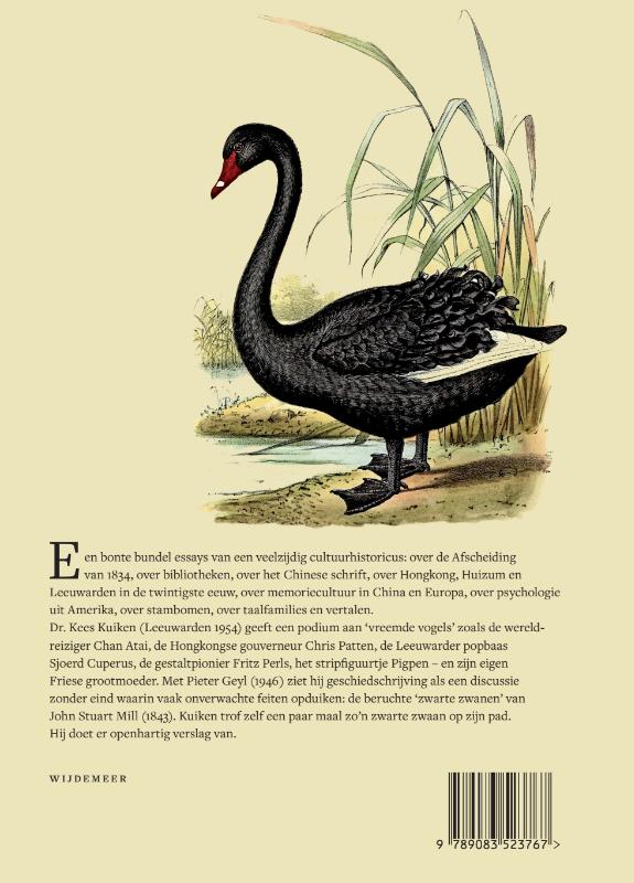 Een bonte bundel essays van een veelzijdig cultuurhistoricus: over de Afscheiding van 1834, over bibliotheken, over het Chinese schrift, over Hongkong, Huizum en Leeuwarden in de twintigste eeuw, over memoriecultuur in China en Europa, over psychologie uit Amerika, over stambomen, over taalfamilies en vertalen. Dr. Kees Kuiken (Leeuwarden 1954) geeft een podium aan ‘vreemde vogels’ zoals de wereldreiziger Chan Atai, de Hongkongse gouverneur Chris Patten, de Leeuwarder popbaas Sjoerd Cuperus, de gestaltpionier Fritz Perls, het stripfiguurtje Pigpen – en zijn eigen Friese grootmoeder. Met Pieter Geyl (1946) ziet hij geschiedschrijving als een discussie zonder eind waarin vaak onverwachte feiten opduiken: de beruchte ‘zwarte zwanen’ van John Stuart Mill (1843). Kuiken trof zelf een paar maal zo’n zwarte zwaan op zijn pad. Hij doet er openhartig verslag van.