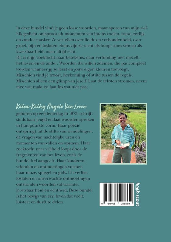 In deze bundel vind je geen losse woorden, maar sporen van mijn ziel. Elk gedicht ontsproot uit momenten van intens voelen, rauw, eerlijk en zonder masker. Ze vertellen over liefde en verbondenheid, over groei, pijn en loslaten. Soms zijn ze zacht als hoop, soms scherp als kwetsbaarheid, maar altijd echt. Dit is mijn zoektocht naar betekenis, naar verbinding met mezelf, het leven en de ander. Woorden die willen ademen, die pas compleet worden wanneer jij ze leest en jouw eigen kleuren toevoegt. Misschien vind je troost, herkenning of stilte tussen de regels. Misschien alleen een glimp van jezelf. Laat de teksten stromen, neem mee wat raakt en laat los wat niet past.