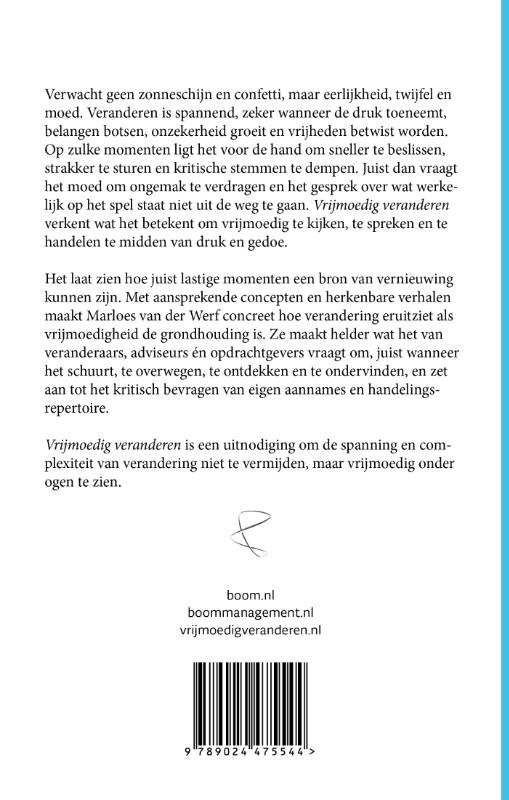 Verwacht geen zonneschijn en confetti, maar eerlijkheid, twijfel en moed. Veranderen is spannend, zeker wanneer de druk toeneemt, belangen botsen, onzekerheid groeit en vrijheden betwist worden. Op zulke momenten ligt het voor de hand om sneller te beslissen, strakker te sturen en kritische stemmen te dempen. Juist dan vraagt het moed om ongemak te verdragen en het gesprek over wat werkelijk op het spel staat niet uit de weg te gaan. Vrijmoedig veranderen verkent wat het betekent om vrijmoedig te kijken, te spreken en te handelen te midden van druk en gedoe. Het laat zien hoe juist lastige momenten een bron van vernieuwing kunnen zijn. Met aansprekende concepten en herkenbare verhalen maakt Marloes van der Werf concreet hoe verandering eruitziet als vrijmoedigheid de grondhouding is. Ze maakt helder wat het van veranderaars, adviseurs én opdrachtgevers vraagt om, juist wanneer het schuurt, te overwegen, te ontdekken en te ondervinden, en zet aan tot het kritisch bevragen van eigen aannames en handelingsrepertoire. Vrijmoedig veranderen is een uitnodiging om de spanning en complexiteit van verandering niet te vermijden, maar vrijmoedig onder ogen te zien. Marloes van der Werf is organisatiepsycholoog, veranderkundige en filosoof. Ze werkt als strategisch adviseur aan vraagstukken over professioneel handelen, vakmanschap en de menselijke maat. Marloes is als kerndocent verbonden aan interuniversitair opleidingsinstituut Sioo en gastdocent aan de NSOB. Vanuit het lectoraat Change Management van De Haagse Hogeschool onderzoekt zij het vrijmoedig moment, hoe vrijmoedigheid vorm en ruimte krijgt in organisaties en waar de grenzen daarvan liggen. Ze is lid van de kernredactie van het Tijdschrift Management & Organisatie en publiceert over veranderen en adviseren vanuit een grondhouding van vrijmoedigheid. ‘Marloes verstaat de kunst professionele twijfel toe te laten in haar eigen denken en handelen. Dat is moedig en uitnodigend, want alleen als we twijfel durven toestaan kunnen we ons ontwikkelen tot een waarachtige veranderprofessional. In Vrijmoedig veranderen laat zij zien hoe vrijmoedigheid als grondhouding veranderprocessen verdiept in plaats van verstoort en nodigt zij ons uit lastige momenten te zien als bron van vernieuwing om samen de dans van verandering aan te gaan.’ – Jaap Boonstra