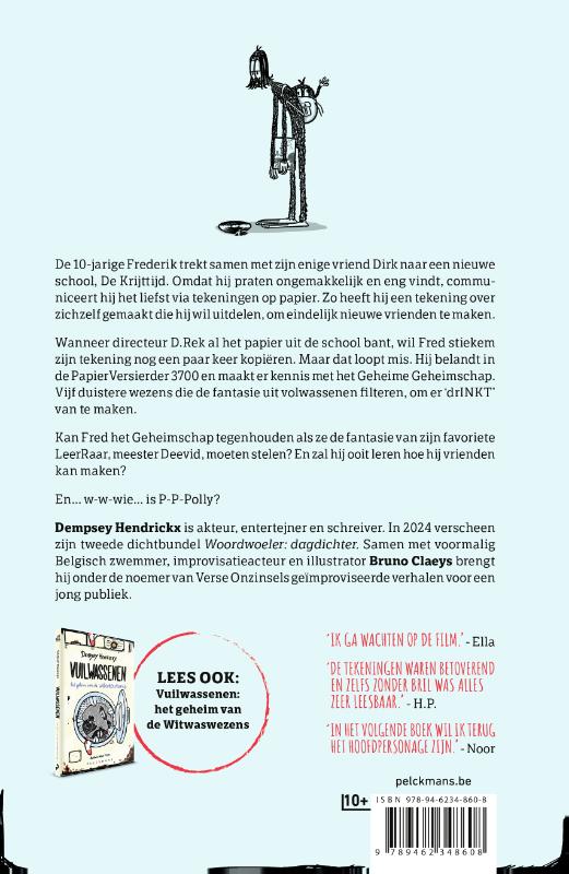 De 10-jarige Frederik trekt samen met zijn enige vriend Dirk naar een nieuwe school, De Krijttijd. Omdat hij praten ongemakkelijk en eng vindt, communiceert hij het liefst via tekeningen op papier. Zo heeft hij een tekening over zichzelf gemaakt die hij wil uitdelen, om eindelijk nieuwe vrienden te maken. Wanneer directeur D.Rek al het papier uit de school bant, wil Fred stiekem zijn tekening nog een paar keer kopiëren. Maar dat loopt mis. Hij belandt in de PapierVersierder 3700 en maakt er kennis met het Geheime Geheimschap. Vijf duistere wezens die de fantasie uit volwassenen filteren, om er ‘drINKT’ van te maken. Kan Fred het Geheimschap tegenhouden als ze de fantasie van zijn favoriete LeerRaar, meester Deevid, moeten stelen? En zal hij ooit leren hoe hij vrienden kan maken? En… w-w-wie… is P-P-Polly? Dempsey Hendrickx is akteur, entertejner en schreiver. In 2024 verscheen zijn tweede dichtbundel Woordwoeler: dagdichter. Samen met voormalig Belgisch zwemmer, improvisatieacteur en illustrator Bruno Claeys brengt hij onder de noemer van Verse Onzinsels geïmproviseerde verhalen voor een jong publiek.