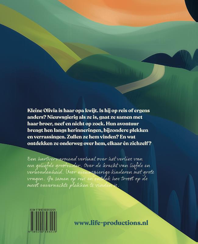 Kleine Olivia is haar opa kwijt. Is hij op reis of ergens anders? Nieuwsgierig als ze is, gaat ze samen met haar broer, neef en nicht op zoek. Hun avontuur brengt hen langs herinneringen, bijzondere plekken en verrassingen. Zullen ze hem vinden? En wat ontdekken ze onderweg over hem, elkaar én zichzelf? Een hartverwarmend verhaal over het verlies van een geliefde grootouder. Over de kracht van liefde en verbondenheid. Voor nieuwsgierige kinderen met grote vragen. Ga samen op reis en ontdek hoe troost op de meest onverwachte plekken te vinden is.