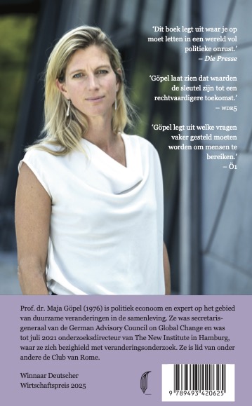 Hoe bied je de crises van deze wereld het hoofd? Om die vraag te beantwoorden duikt Maja Göpel in de geschiedenis van onze waarden. Waar komen ze vandaan, en hoe hebben ze ons als burgers gevormd? Waaraan kennen we gewicht toe? Göpel identificeert drie pijlers: vrijheid, solidariteit en rechtvaardigheid. Alleen zijn we die waarden meer en meer op het ‘ik’ gaan betrekken, en minder en minder op het ‘wij’. Om onze democratie te laten functioneren is het noodzakelijk om gezamenlijk op te trekken. Kunnen we de uitdagingen van de toekomst het hoofd bieden door de essentie van onze waarden opnieuw te onderzoeken?